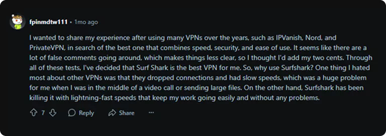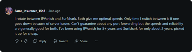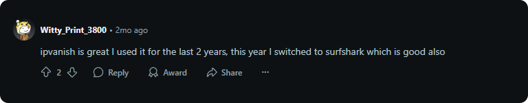 If you’re torn between Surfshark and IPVanish, Reddit can be a great place to find real user feedback and get some first-hand insights. Here are some comments from various subreddits regarding the subject: