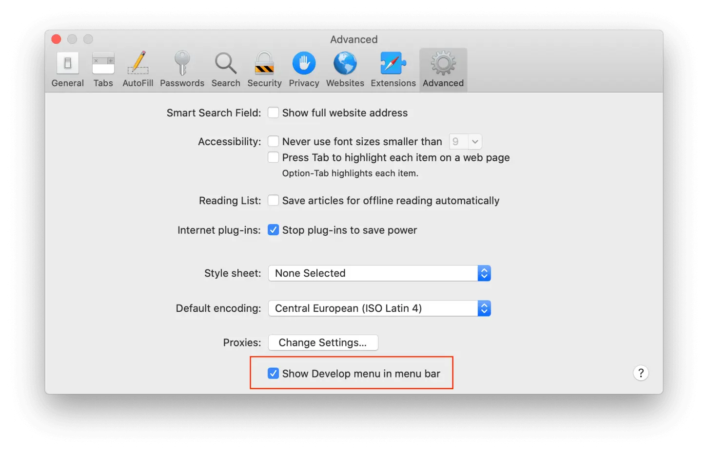 1. Öffne die Safari-Einstellungen. Klicke dort auf „Menü ‚Entwickler‘ in der Menüleiste anzeigen“.